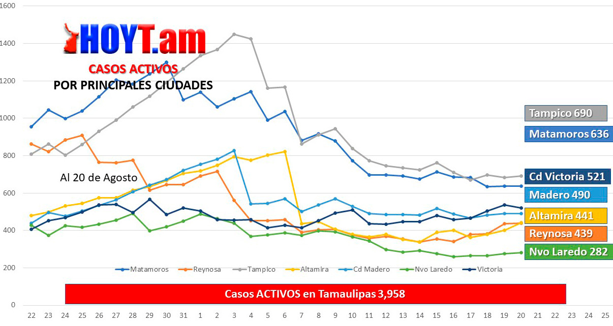 El crecimiento de casos activos se ha visto impactado en las curvas de las ciudades importantes, por ejemplo, pese a que el alcalde de Ciudad Victoria, Xicoténcatl González dijo que se ha controlado la situación en la capital de Tamaulipas, la realidad es que es la más afectada en los últimos días, al pasar de 458 casos que tenía el domingo a 521 que registró el jueves, es decir 63 casos activos más.