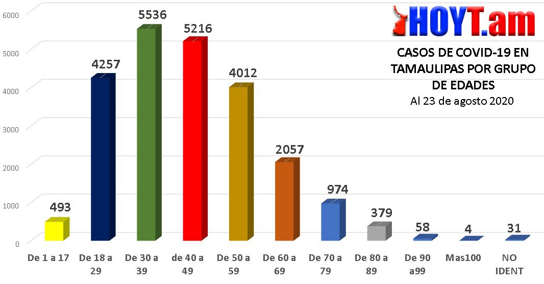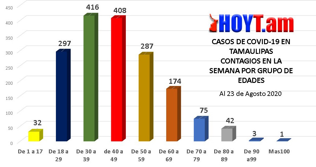 Durante la Semana Epidemiológica 34, el rango de edad de los 30 a 39 años fueron los que más contagios registraron. Según las cifras fueron un total de 416 tamaulipecos. Le siguieron los de 40 a 49 años con 408 casos.