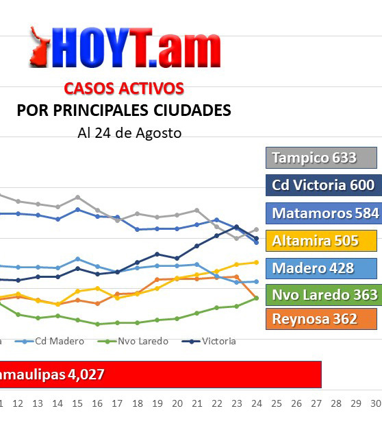 Actualmente las cifras de casos activos son: Tampico, 633 casos; Ciudad Victoria, 600; Matamoros, 584; Altamira, 505; Madero, 428; Nuevo Laredo, 363 y Reynosa con 362.