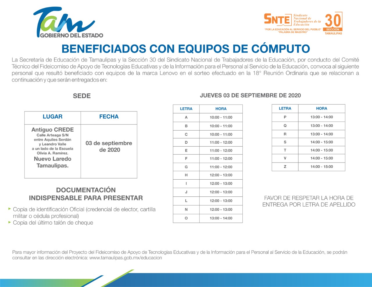 Nuevo Laredo, Tamaulipas. - La Secretaría de Educación de Tamaulipas y la Sección 30 del Sindicato Nacional de Trabajadores de la Educación, por conducto del Comité Técnico del Fideicomiso de Apoyo de Tecnologías Educativas y de la Información para el Personal al Servicio de la Educación, convoca al personal que resultó beneficiado con equipos de cómputo, de la marca Lenovo en el sorteo efectuado en la 18° Reunión Ordinaria.