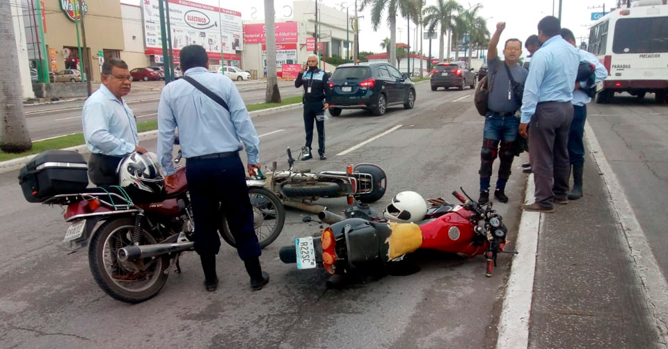 Agentes viales acordonaron el área, toda vez que los motociclistas quedaron aturdidos y con algunos golpes leves en la cinta de rodamiento.