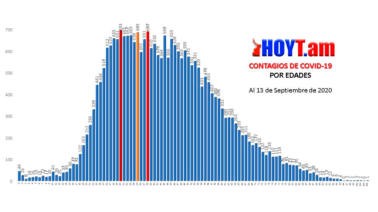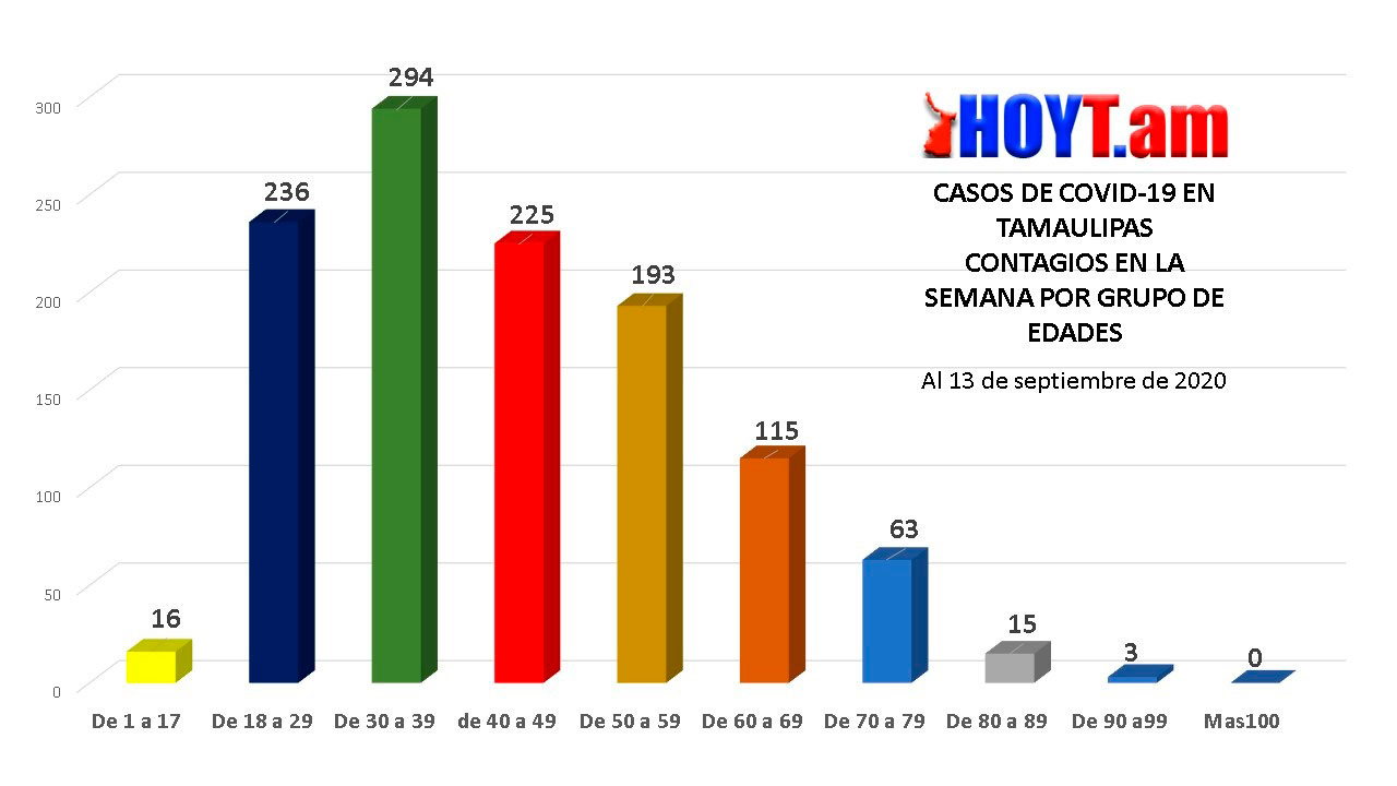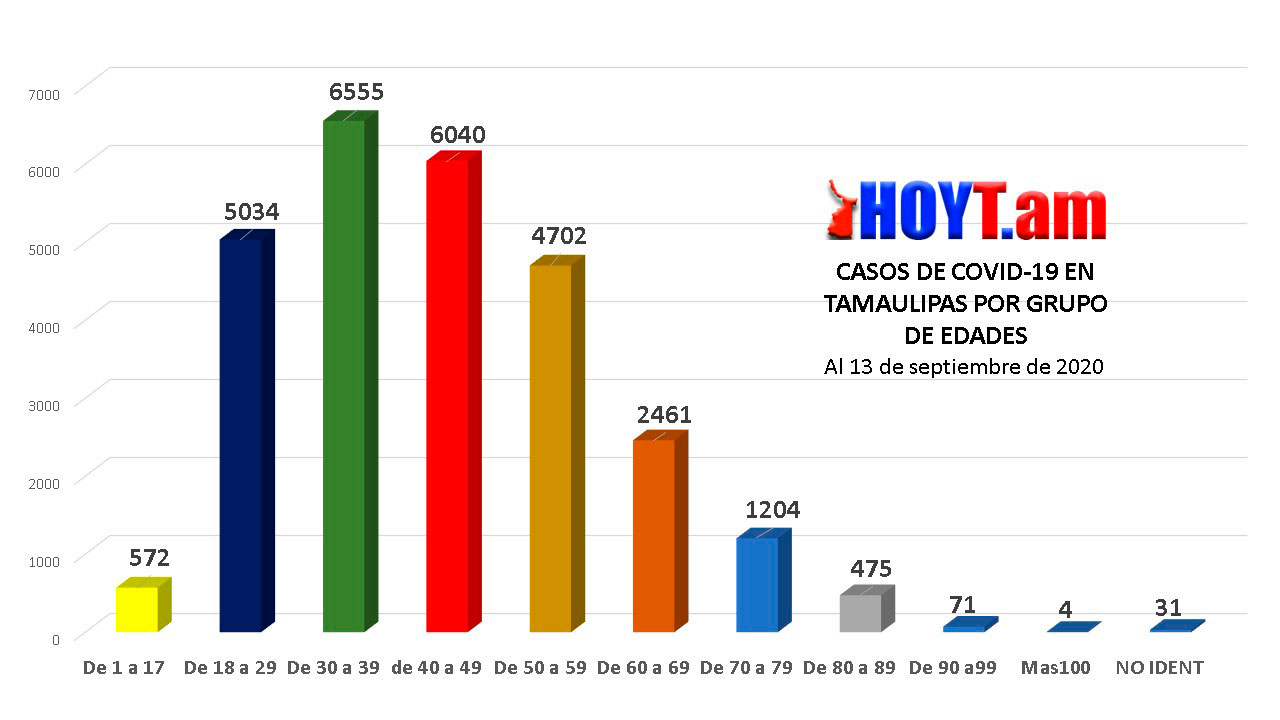 Desde que inició la pandemia, en Tamaulipas han contraído la enfermedad 27 mil 149 tamaulipecos, de este número 693 casos corresponden a personas de 30 años, quienes ocupan el primer lugar en contagios; con 687 le siguen los de 38 años y con 683 los de 35 años.