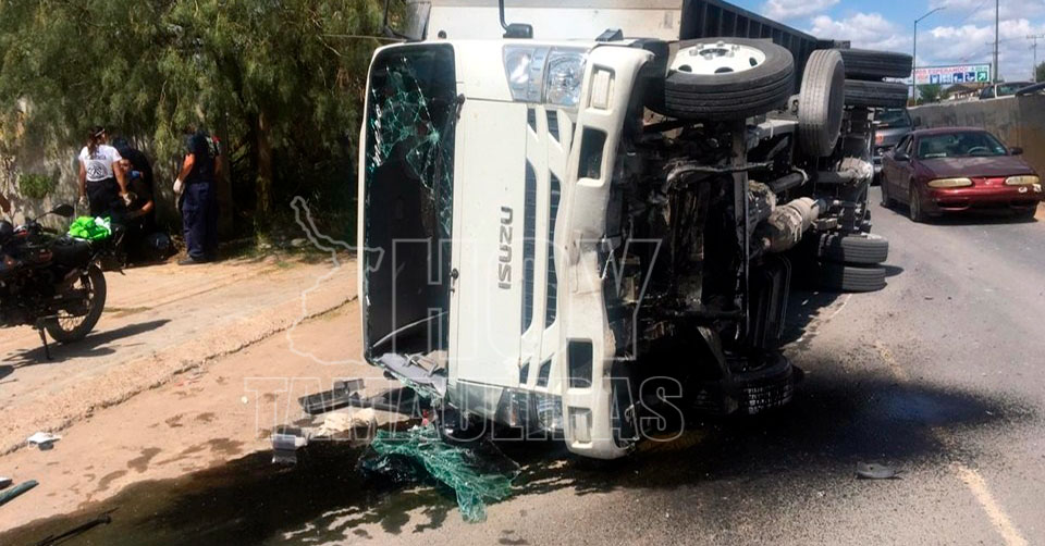 Nuevo Laredo, Tamaulipas. ─ Un conductor de un camión de carga resultó lesionado al sufrir la volcadura del vehículo que manejaba en la Carretera Nacional, en Nuevo Laredo, aparentemente por conducir con exceso de velocidad.