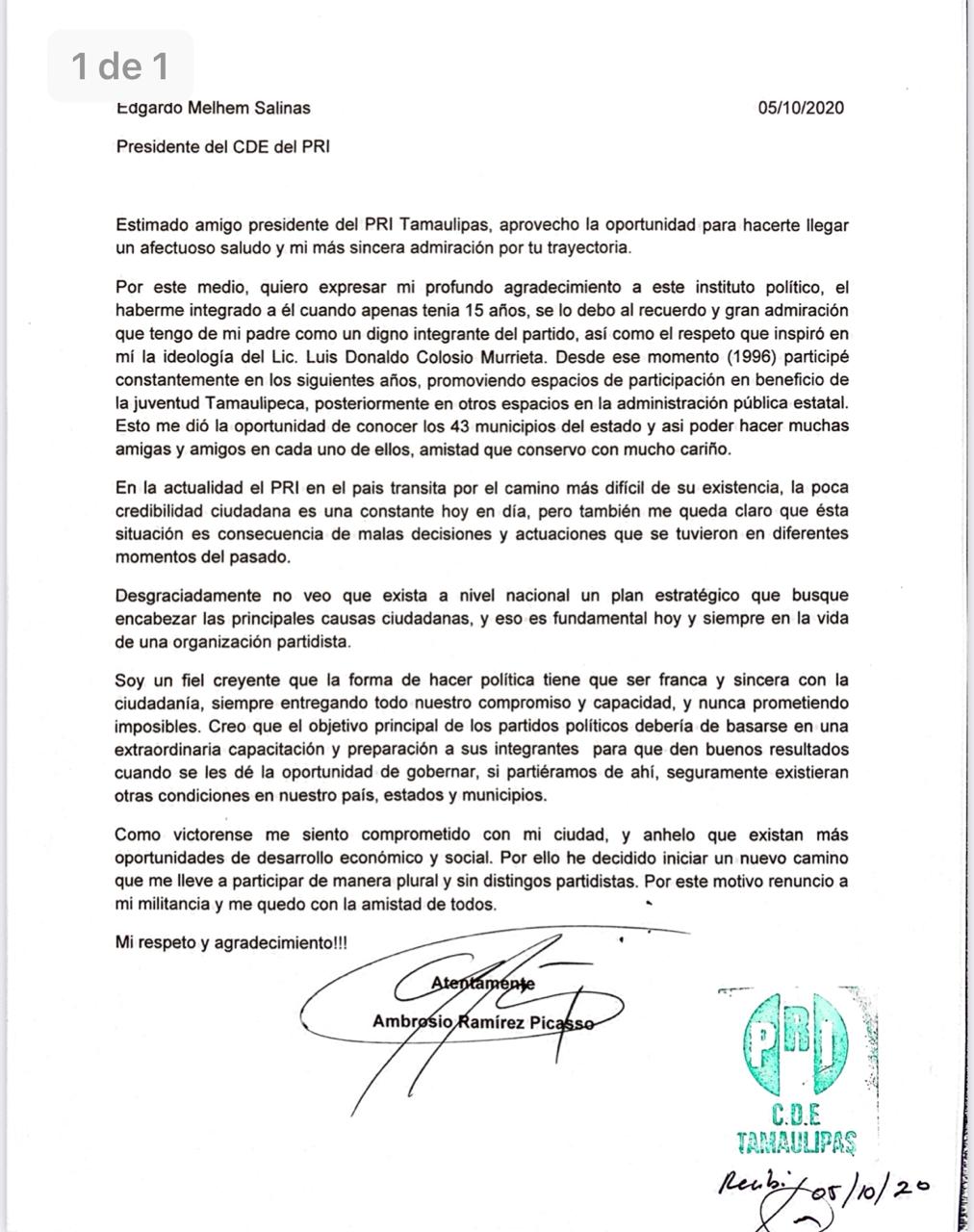Ciudad Victoria, Tamaulipas. – El victorense Ambrosio Ramírez Picasso, presentó hoy lunes su renuncia a la militancia del Partido Revolucionario Institucional (PRI) mediante una carta enviada al dirigente estatal del tricolor en Tamaulipas, Edgar Melhem Salinas.