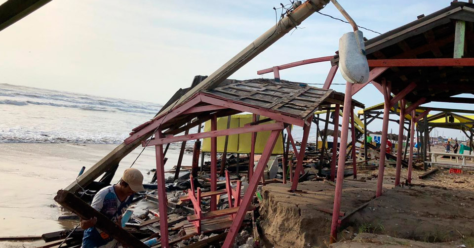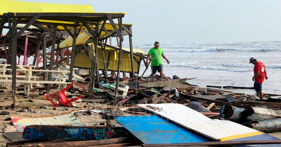 Matamoros, Tamaulipas.- La presencia del Huracán Delta frente a las costas de Tamaulipas provocó que el fuerte oleaje causara daños en la playa Bagdad, derribando varias palapas, además de escaleras de concreto, techumbres y ha afectado restaurantes ubicados cerca al mar.