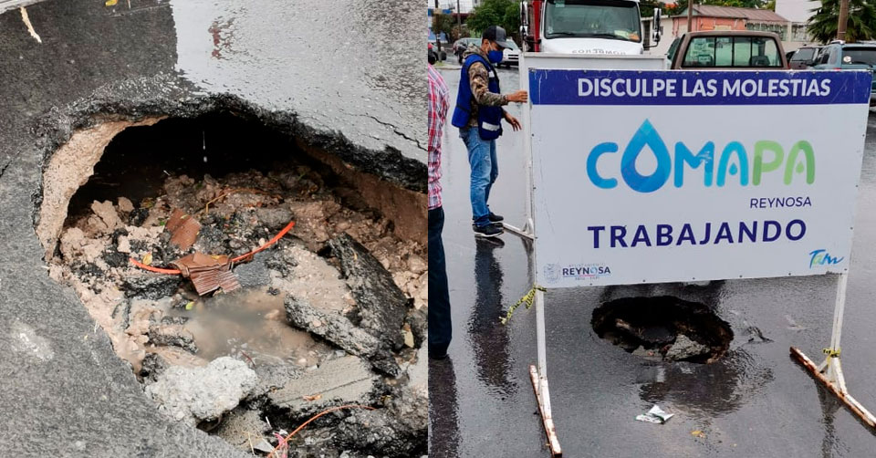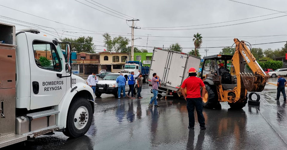 Reynosa, Tamaulipas. - Un camión cayó en un socavón provocado por el reblandecimiento del pavimento en una de las calles de la colonia Las Cumbres, como consecuencia de la lluvia registrada está mañana en Reynosa, Tamaulipas.