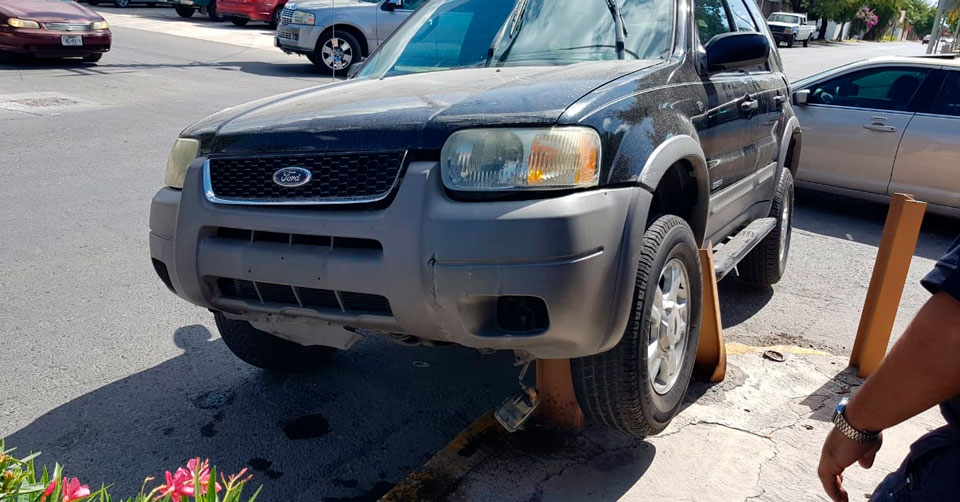Nuevo Laredo, Tamaulipas. ─ Para no chocar contra una camioneta que se le atravesó, un conductor le sacó la vuelta y en la maniobra terminó trepando a un riel de contención que protege las instalaciones de una vivienda en Nuevo Laredo.