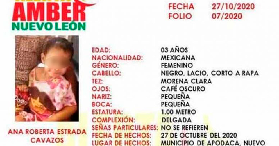 De acuerdo con las primeras versiones, la pequeña fue identificada como Ana Roberta "N", y presuntamente fue arrebatada de los brazos de sus madre por un desconocido cuando estaba en la vía pública en el municipio de Apodaca.