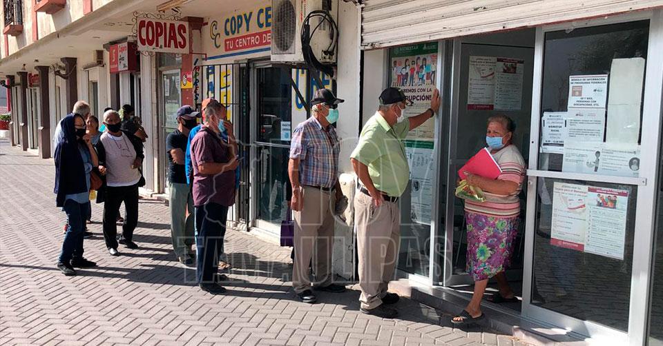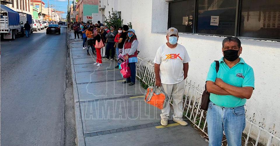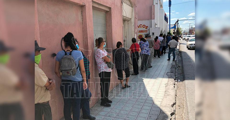 Sin respetar sana distancia y con largas filas abuelitos cobran pensión en Matamoros