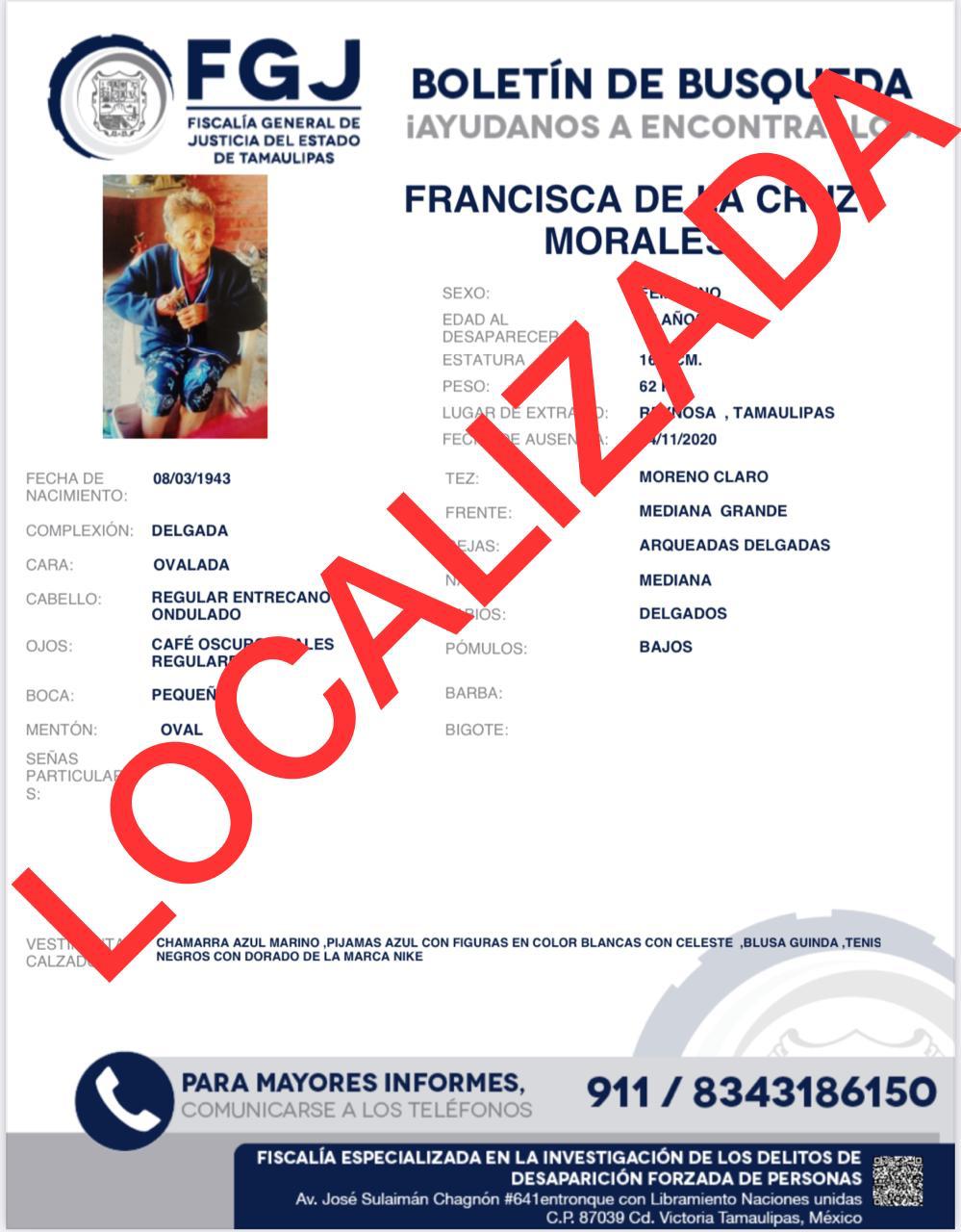 La mujer de 77 años de edad, identificada como Francisca de la Cruz Morales, la habían reportado sus familiares y hasta se había realizado un boletín de búsqueda por parte de la Fiscalía General de Justicia del Estado de Tamaulipas.
