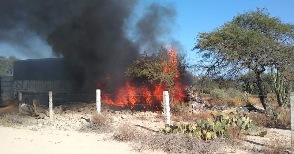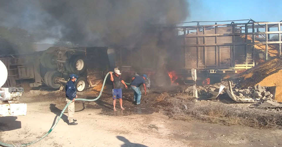 El tractor fue consumido por las llamas, mientras que la carga de soya que trasportaba quedó regada entre la maleza.