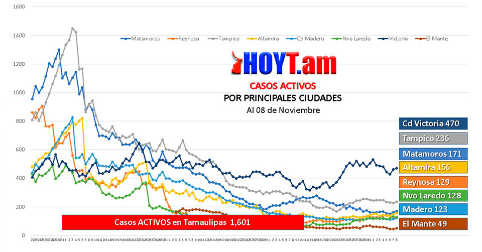 Debido a que el domingo hubo 93 contagios, cinco muertos y solamente 49 recuperados, esto provocó que la curva tuviera un incremento afectando a casi todas las ciudades importantes. En ese sentido, Ciudad Victoria registró 470 casos, Tampico 236, Matamoros 171, Altamira 156 y Reynosa otros 129 casos.