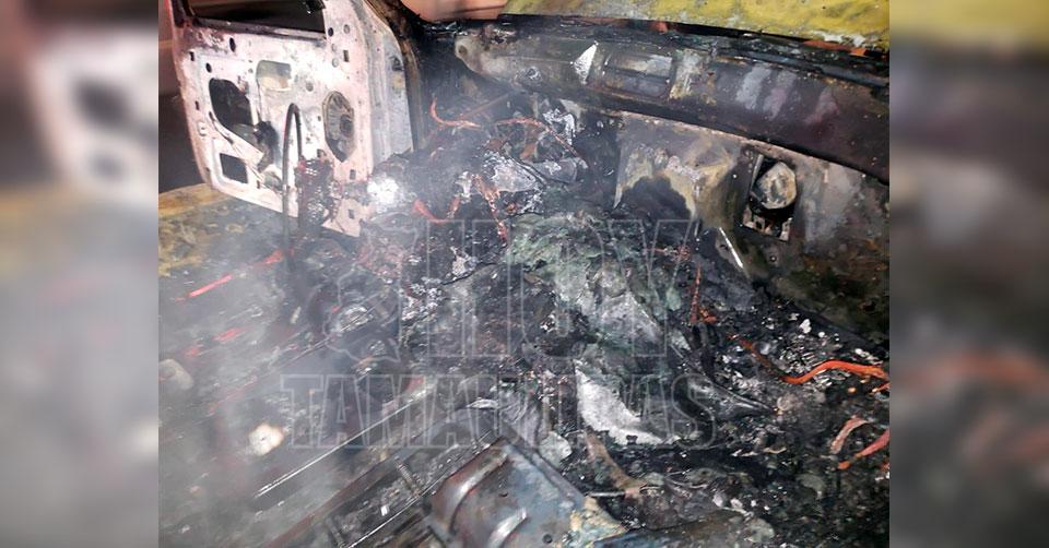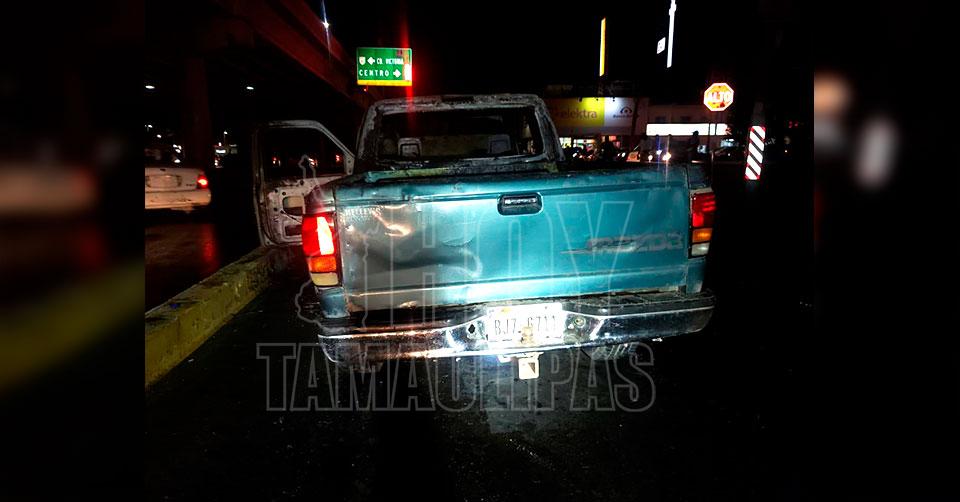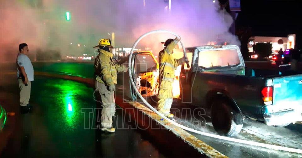 Matamoros, Tamaulipas. - Una camioneta terminó en pérdida total después de consumirse en llamas, fuego provocado por un derrame de aceite en la transmisión.
