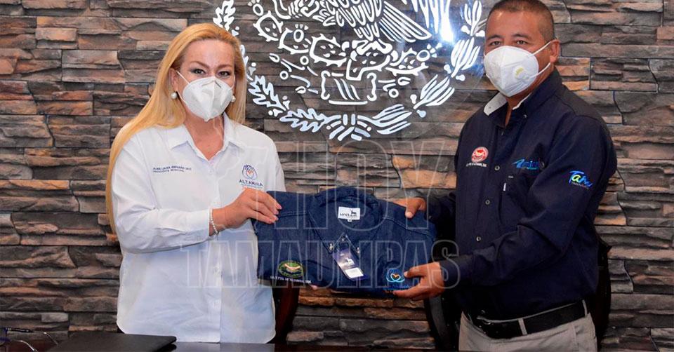 Altamira, Tamaulipas. - Brindando su incondicional apoyo y respaldo a los integrantes del Sindicato Único de Trabajadores del Republicano Ayuntamiento de Altamira (SUTRA), con quienes el Gobierno de Altamira ha conformado un gran equipo de trabajo, la alcaldesa Alma Laura Amparán Cruz, otorgó uniformes y diferentes materiales, con la finalidad de ofrecerles mayores garantías en su función diaria a favor la comunidad altamirense.