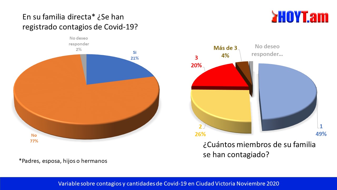 En contra parte, el 21 por ciento indicó que el Covid-19 infectó a su familia directa (padres, esposos, hijos o hermanos) y de este número, se indicó con el 49% de un solo caso en la familia, el 26% con dos, el 20% con tres contagios y el 4% con más de tres infecciones.