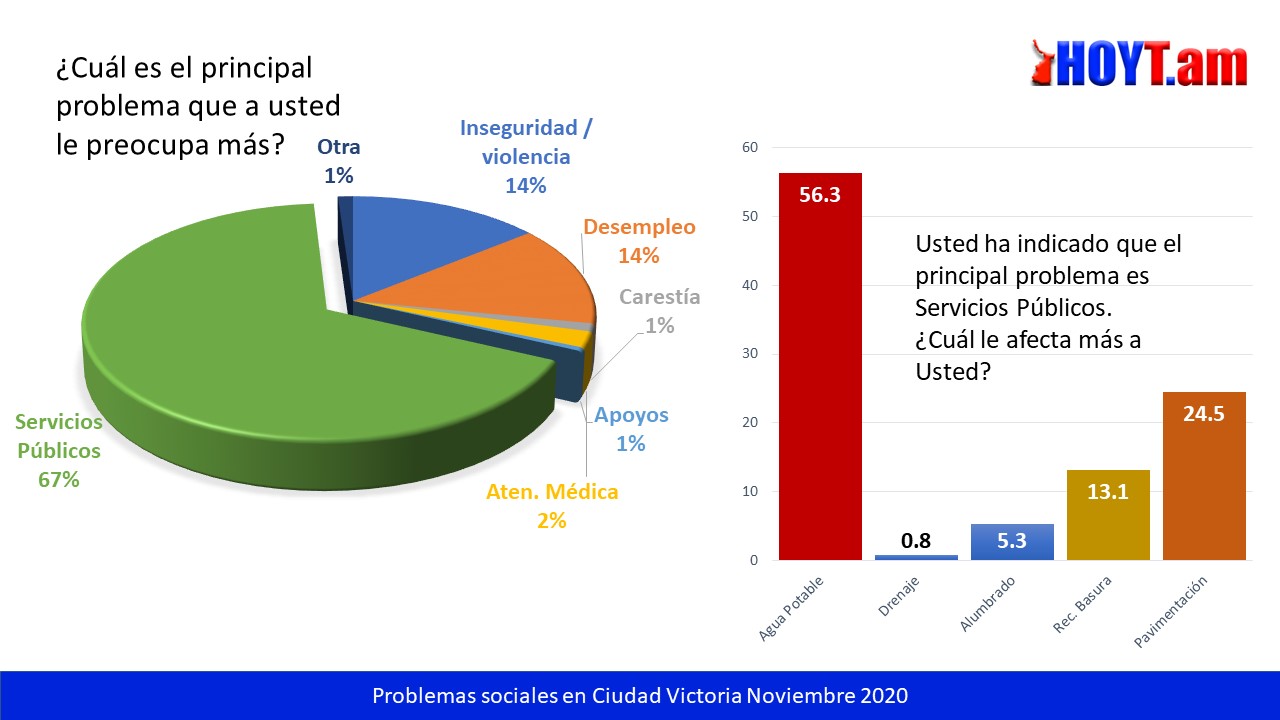 En cuanto a los servicios públicos, a los victorenses en un 56.3 por ciento les afecta más la falta de agua, seguido por la pavimentación/bacho/mal estado de calles con un 24.5 por ciento y la recolección de basura en un 13.1 por ciento.