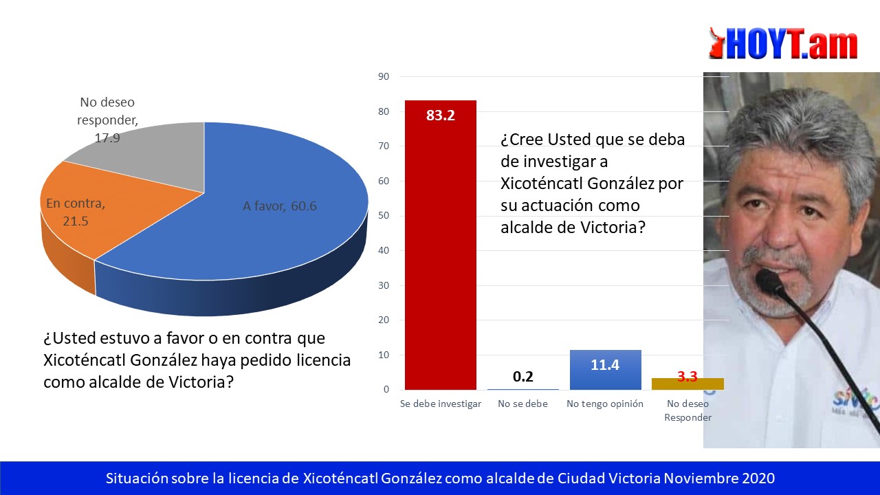 El 60.6% de los encuestados estuvo a favor que Xicoténcatl González pidiera licencia para separarse de su cargo como alcalde de Victoria, contra un 21.5% que estuvo en contra y un 17.9% que indicó “no desear responder”.