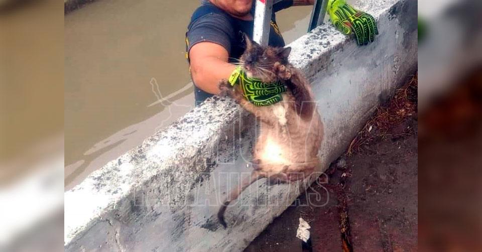 Bomberos rescatan a un "michi" de una alcantarilla en Ciudad Madero