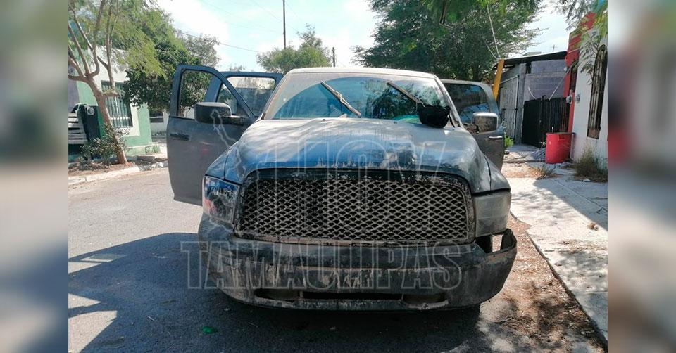 Cuadras más adelante, sobre la calle Marruecos se le dio alcance a una Dodge RAM 1500 doble cabina, color gris, modelo 2009, de la que descendieron dos hombres quienes intentaron darse la fuga, logrando su detención cuando se escondían entre el monte.
