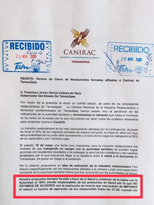 "Nuestra propuesta siempre ha sido a favor de la salud y colaborar de la mano con la autoridad al cien por ciento siendo responsables de los protocolos de Salud por lo que no estamos de acuerdo con las restricciones de horario que nos acaban de imponer al reducir el horario de operaciones de los restaurantes hasta las 21:30 horas", señaló a través del comunicado.