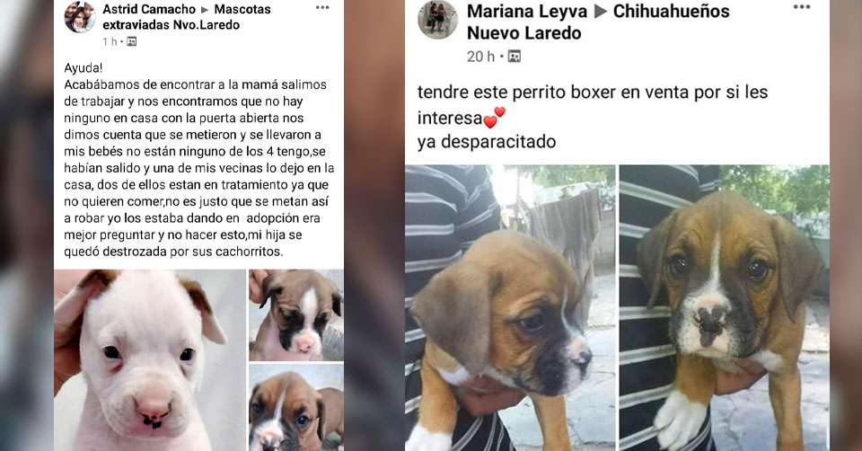 Nuevo Laredo, Tamaulipas. - Una mujer denunció a través del Grupo de Facebook Mascotas Extraviadas Nvo. Laredo el robo de cuatro cachorritos en su hogar, pero además salió a relucir que los estaban vendiendo en otro foro de la misma red social.
