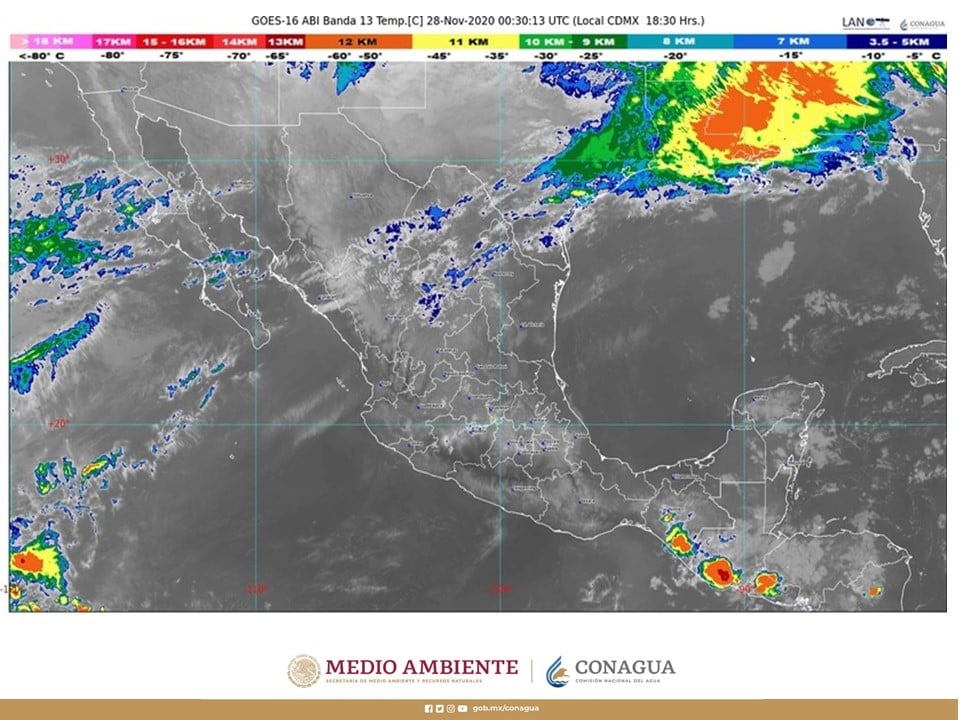 Un canal de baja presión y la entrada de humedad del Océano Pacífico y el Golfo de México mantendrán chubascos en Chiapas, Puebla, Quintana Roo y Veracruz, y lluvias aisladas (de 0.1 a 5 mm) en Campeche, Estado de México, Guerrero, Hidalgo, Michoacán, Oaxaca, Querétaro, Tabasco y Yucatán.