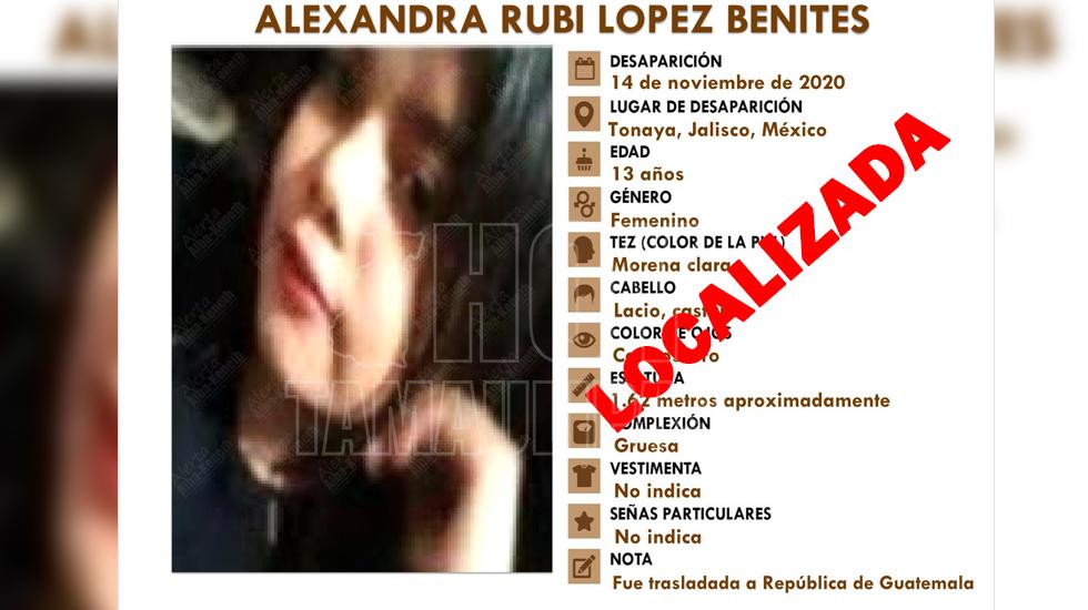 En el despliegue de búsqueda internacional que se estableció para dar con el paradero de esta niña, participaron autoridades de las Fiscalías de Jalisco, Chiapas, elementos de Alerta Amber, así como de Guatemala, gracias lo que pudo ser ubicada y hallada en perfectas condiciones.