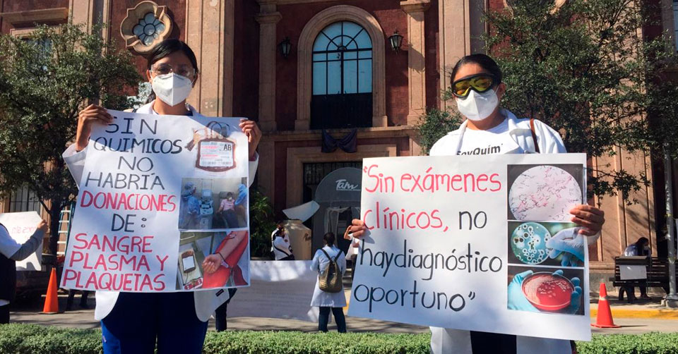 “Sin químicos no habría donaciones de sangre, plasma o plaquetas”, “Nosotros también tenemos familia, pero no podemos quedarnos en casa”, “Héroes anónimos e invisibles para la Secretaría de Salud”, “Nos llaman héroes sin capa, pero no nos pagan lo que es justo”, dicen algunas mantas.