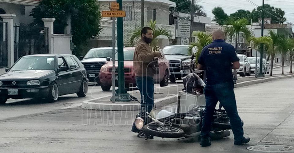 Tampico, Tamaulipas. – El conductor de una motocicleta quedó lesionado tras impactar su frágil unidad motriz contra un vehículo compacto habilitado para el transporte público en Tampico.