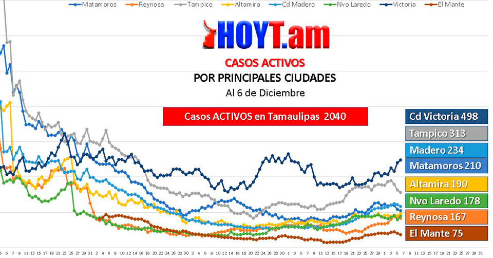 En los últimos dos días, la curva de casos activos se ha disparado en Ciudad Victoria, Altamira y Nuevo Laredo, mientras que desde hace cuatro días va a la baja en Tampico.
