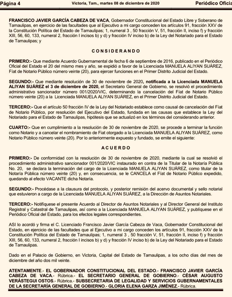 “De conformidad con la resolución de 30 de noviembre de 2020, mediante la cual se resolvió el procedimiento administrativo sancionador 001/2020/VIC instaurado en contra de la Titular de la Notaría Pública No. 20, se declara la terminación del cargo de la Licenciada MANUELA ALIYAN SUÁREZ, como titular de la Notaría Pública número veinte (20) y, en consecuencia, se le CANCELA el Fíat de Notario Público expedido, quedando al efecto VACANTE dicha Notaría”.