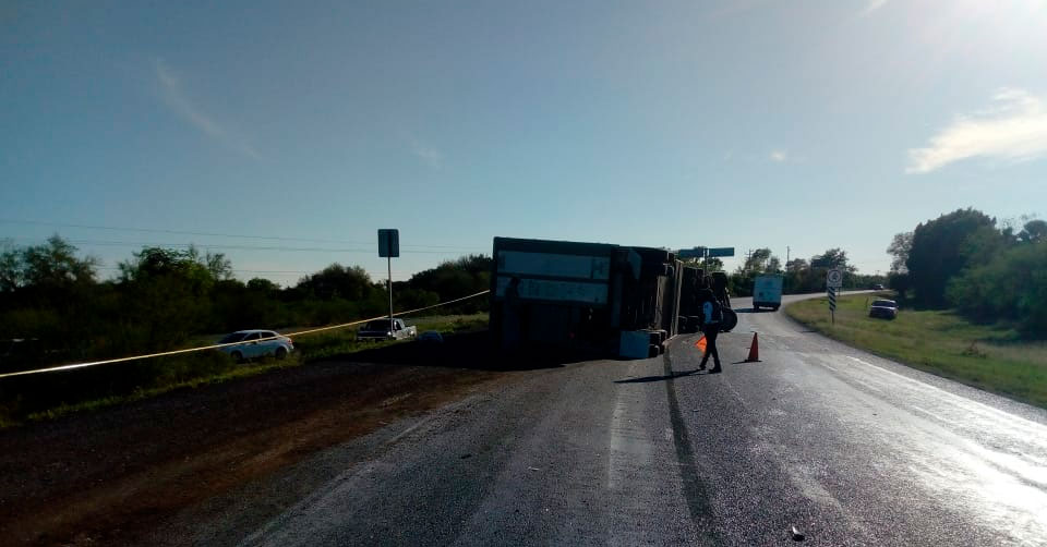 Jiménez, Tamaulipas. - Un tracto camión articulado con un contenedor en el que transportaba becerros volcó esta tarde en el kilómetro 95 de la carretera Victoria-Matamoros.