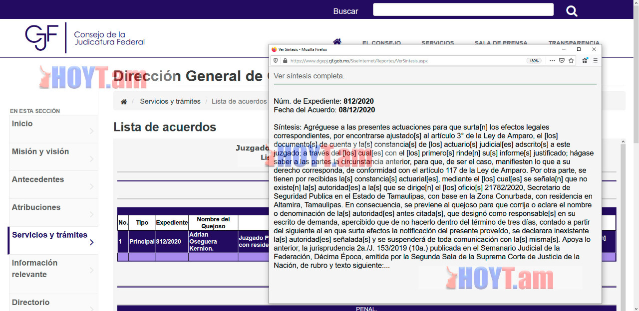 El expediente quedó radicado en el número 812/2020, con fecha del 8 de diciembre y es contra el Juzgado Primero de Primera Instancia del Ramo Penal, con residencia en Ciudad Madero y otros.
