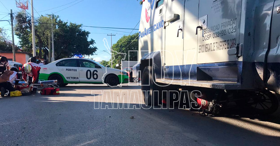 Ciudad Victoria, Tamaulipas. - Un motociclista resultó lesionado esta mañana luego de chocar contra un camión de valores y su moto quedó debajo de la pesada unidad, en el 21 Berriozábal.