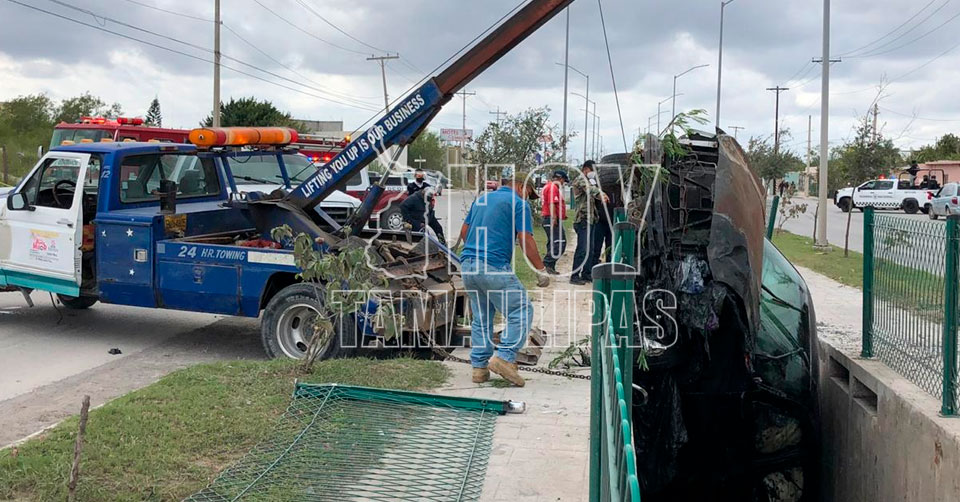 Matamoros, Tamaulipas. -El exceso de velocidad y el conducir sin precaución, fueron las causas de un accidente que se registró esta mañana en el Libramiento Emilio Portes Gil donde una camioneta cayó al canal luego de chocar contra un poste de alumbrado público.
