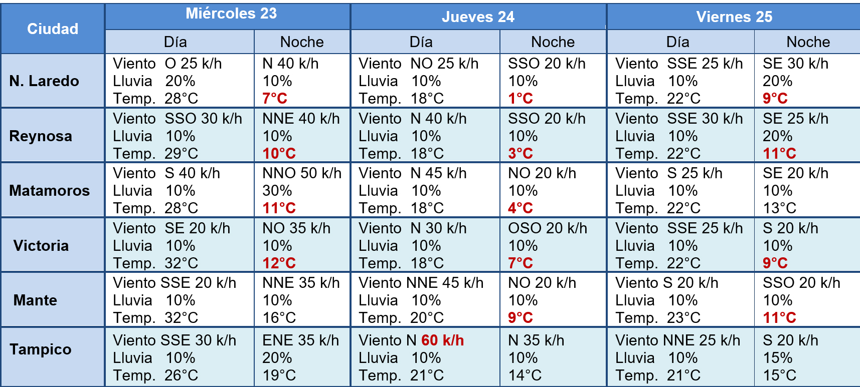 En la zona centro se espera a partir del miércoles temperatura máxima de 32°C y mínimas de 7°C, con viento moderado de dirección norte de 20-35 km/h con rachas que podrían superar los 60 km/h principalmente en zonas costeras. Se mantendrá clima muy frio en zonas altas (mínima de 0°C durante la noche en Miquihuana).