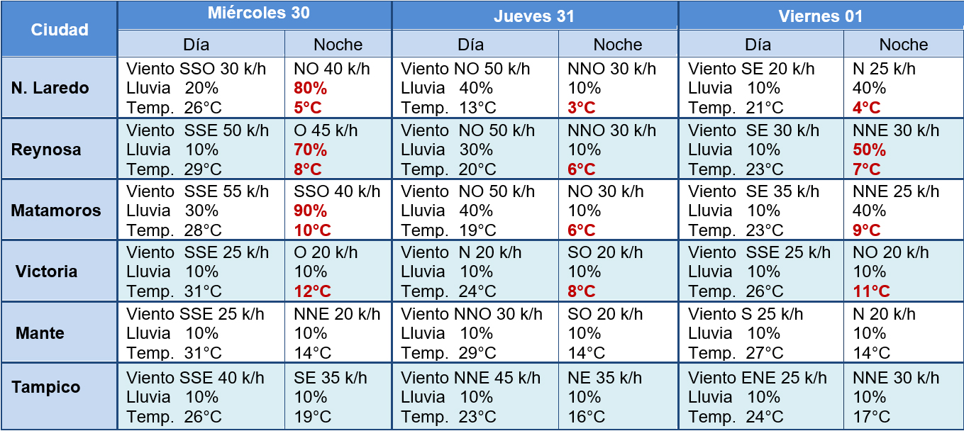 Ciudad Victoria, Tamaulipas. - El ingreso del Frente Frío No. 24, provocará un marcado descenso de temperatura a partir del miércoles, en la mayor parte del Estado, principalmente en la zona norte y zonas altas, estará acompañado de viento fuerte de dirección norte y probabilidad de lluvia de ligera a moderada durante su ingreso, principalmente en la zona norte.