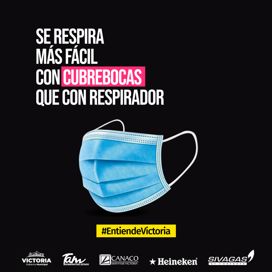 Ciudad Victoria, Tamaulipas. - Con la sugerencia "Se respira más fácil con cubrebocas que con respirador", la Cámara Nacional de Comercio (Canaco) de Ciudad Victoria intensificó su campaña #EntiendeVictoria.
