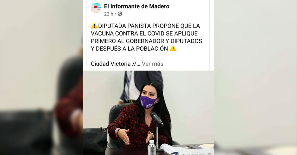 La publicación indica; “La diputada panista propone que la vacuna contra el COVID se aplique primero al gobernador y diputados y después a la población” y se asegura que la legisladora había presentado un punto de acuerdo.