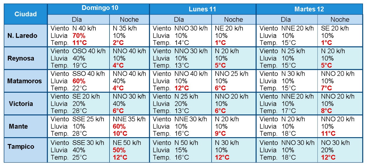 Se prevé a partir del domingo temperatura máxima de 28°C y mínimas de 6°C, con viento moderado de dirección norte de 20-30 km/h con rachas que podrían superar los 60 km/h principalmente en zonas costeras. Se mantendrá clima muy frio en zonas altas (mínima de 2°C durante la noche en Miquihuana).