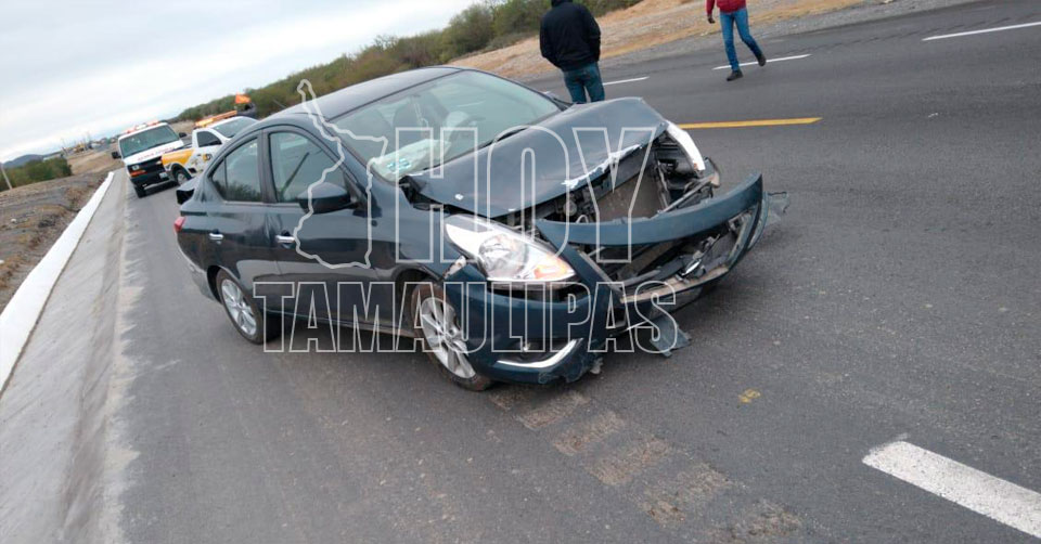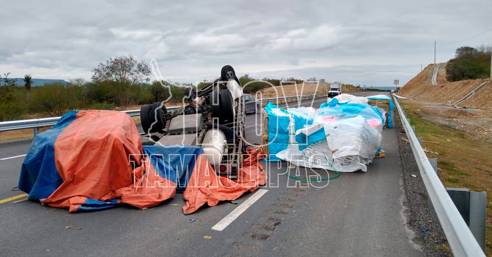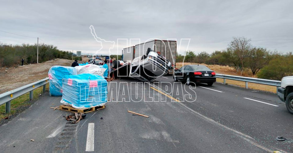 González, Tamaulipas. – Un choque con volcadura entre un camión de carga y un vehículo particular dejó como saldo cuantiosos daños materiales en el kilómetro 1 de la carretera González-Zaragoza, a la altura del rancho "Los Chachos".