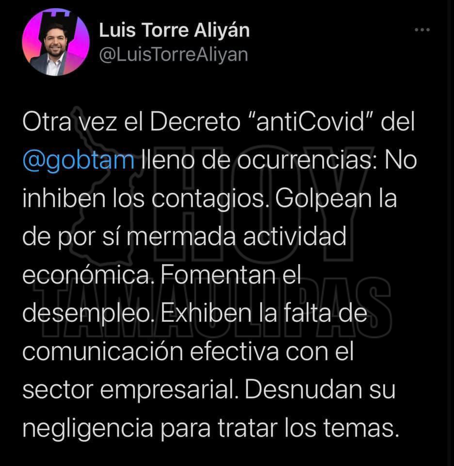 “Otra vez el decreto “antiCovid”, del @gobtam, lleno de ocurrencias: No inhiben los contagios. Golpean la de por sí mermada actividad económica. Fomenta el desempleo. Exhiben la falta de comunicación efectiva, con el sector empresarial. Desnudan su negligencia para tratar los temas.”