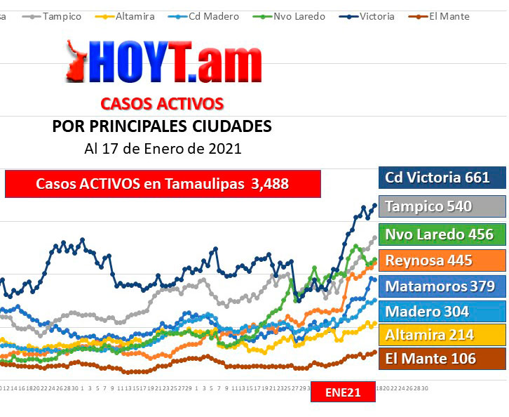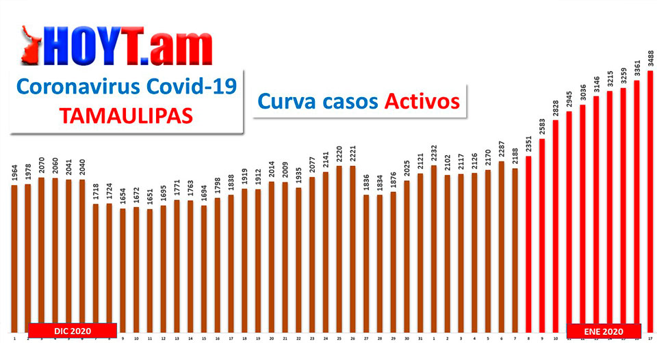 Hasta anoche, en Tamaulipas se tenían registrados 44 mil 244 casos positivos a la enfermedad y de estos, 37 mil 162 se habían recuperado y 3,594 habían fallecido, quedando 3 mil 488 casos activos, es decir, el número de persona que todavía padecen la enfermedad.