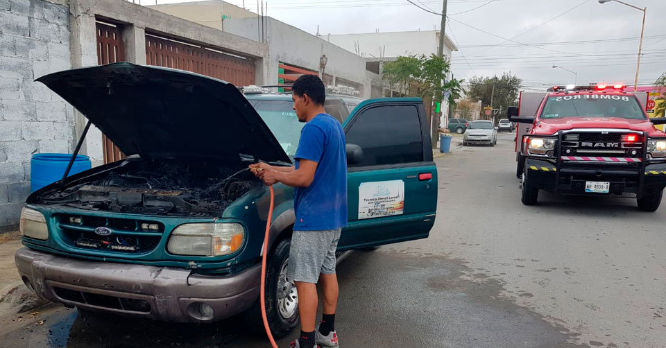 Nuevo Laredo, Tamaulipas. ─ Una camioneta se incendió por un supuesto cortocircuito mientras su conductor se encontraba dentro de la unidad, al parecer revisándola, hechos ocurridos en Nuevo Laredo.