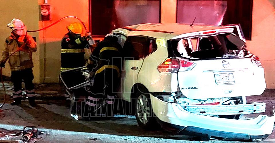 Tampico, Tamaulipas. - Una mujer prensada y elevados daños materiales, fue el resultado de una carambola registrada esta noche en la avenida Hidalgo de Tampico.