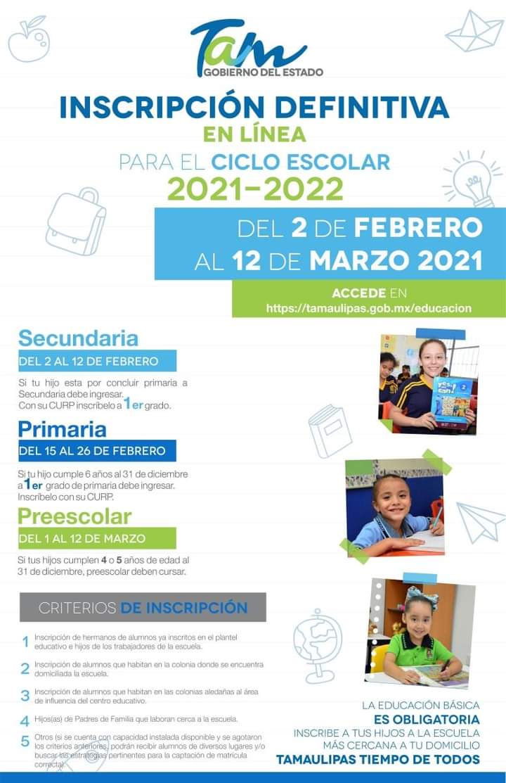 Matamoros, Tamaulipas. - La Secretaría de Educación en Tamaulipas (SET) dio a conocer los períodos de inscripción definitiva para cada nivel académico en educación básica, esto con miras al período escolar 2021-2022, informó la jefa del Centro Regional de Desarrollo Educativo (Crede) en Matamoros, María Elena Flores Montalvo.