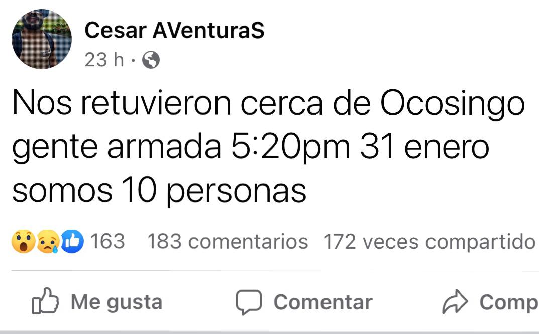 Fue en su página de Facebook que Cesar Vela denunció los hechos a través del siguiente mensaje: “Nos retuvieron cerca de Ocosingo gente armada 5:20 pm 31 enero somos 10 personas”, publicó el joven mochilero en su última publicación.