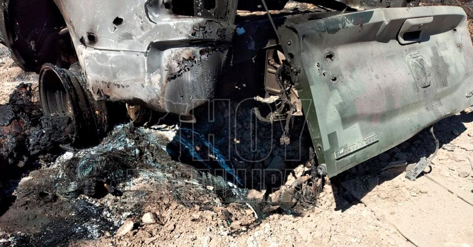 Miguel Alemán, Tamaulipas. - Los cuerpos calcinados de cuatro personas fueron encontrados en una camioneta clonada de la Secretaría de la Defensa Nacional (Sedena), en el Rancho El Barretal, perteneciente al municipio de Miguel Alemán.