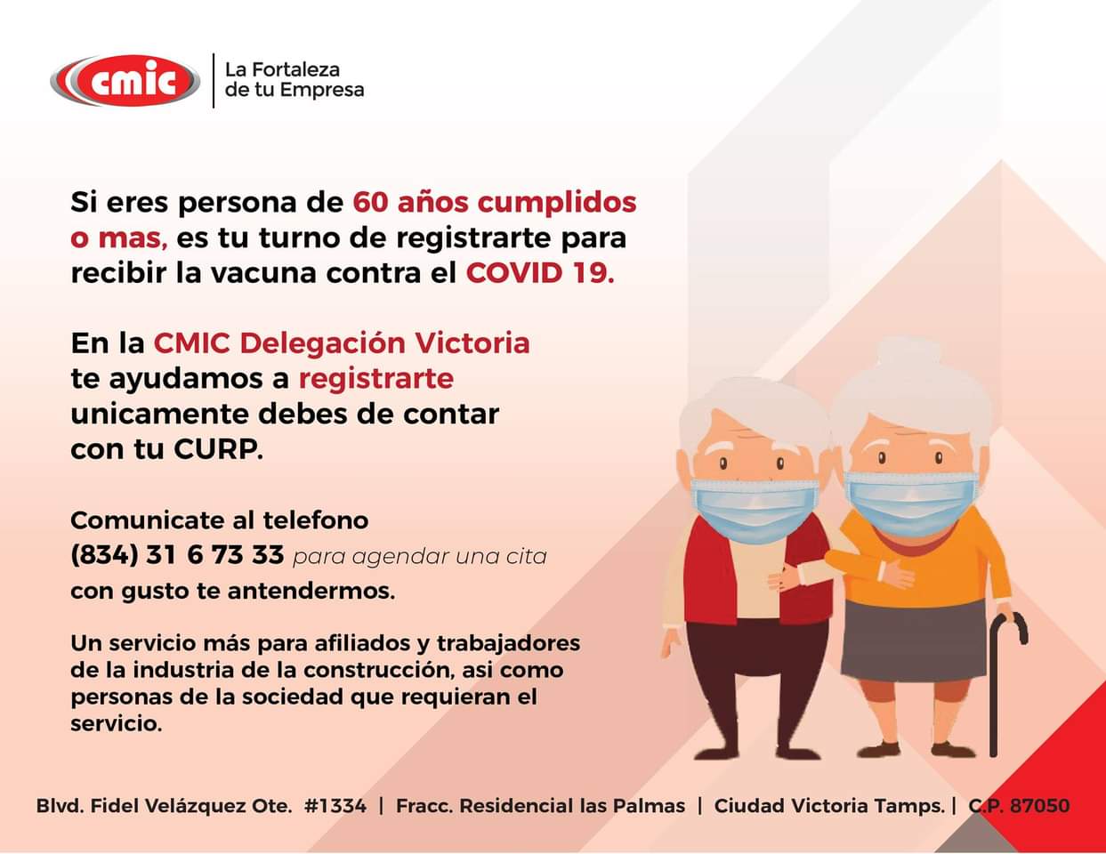 Ciudad Victoria, Tamaulipas.- La delegación de la Cámara Mexicana de la Industria de la Construcción (CMIC) Victoria, ofrece apoyo a los adultos mayores de 60 años que necesiten ayuda para su registro en la plataforma digital mivacuna.salud.gob.mx, y enlistarse para recibir su vacuna contra el Covid-19.