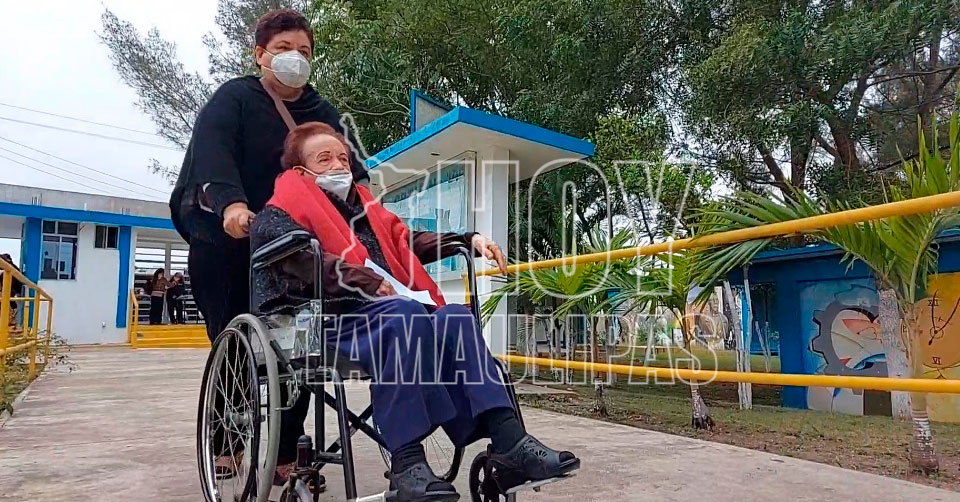 Altamira, Tamaulipas. - En sillas de rueda, y otros más apoyados por sus familiares, cientos de abuelitos acudieron esta mañana a las instalaciones del Centro de Bachillerato Tecnológico Industrial y de Servicios (CBTis) número diez, uno de los 19 puntos que se instalaron en Tamaulipas para vacunar a los adultos mayores, luego de que se suspendiera por dos días por las bajas temperaturas que provocó el Frente Frío No. 35.